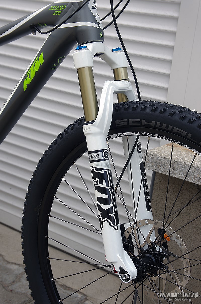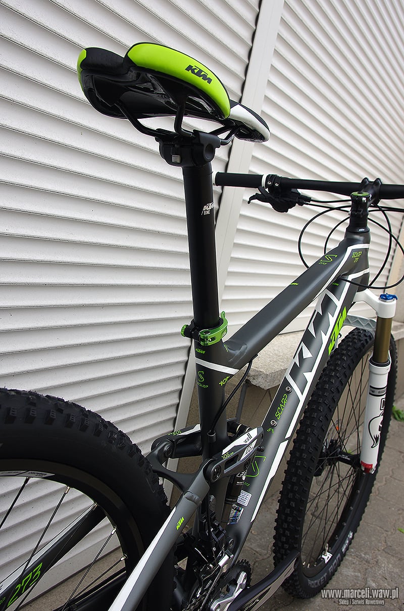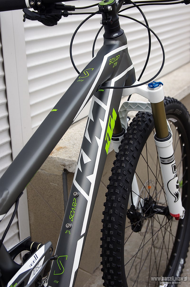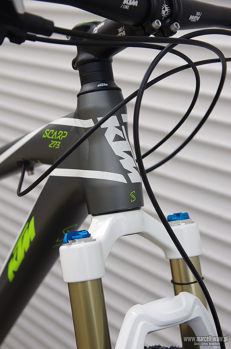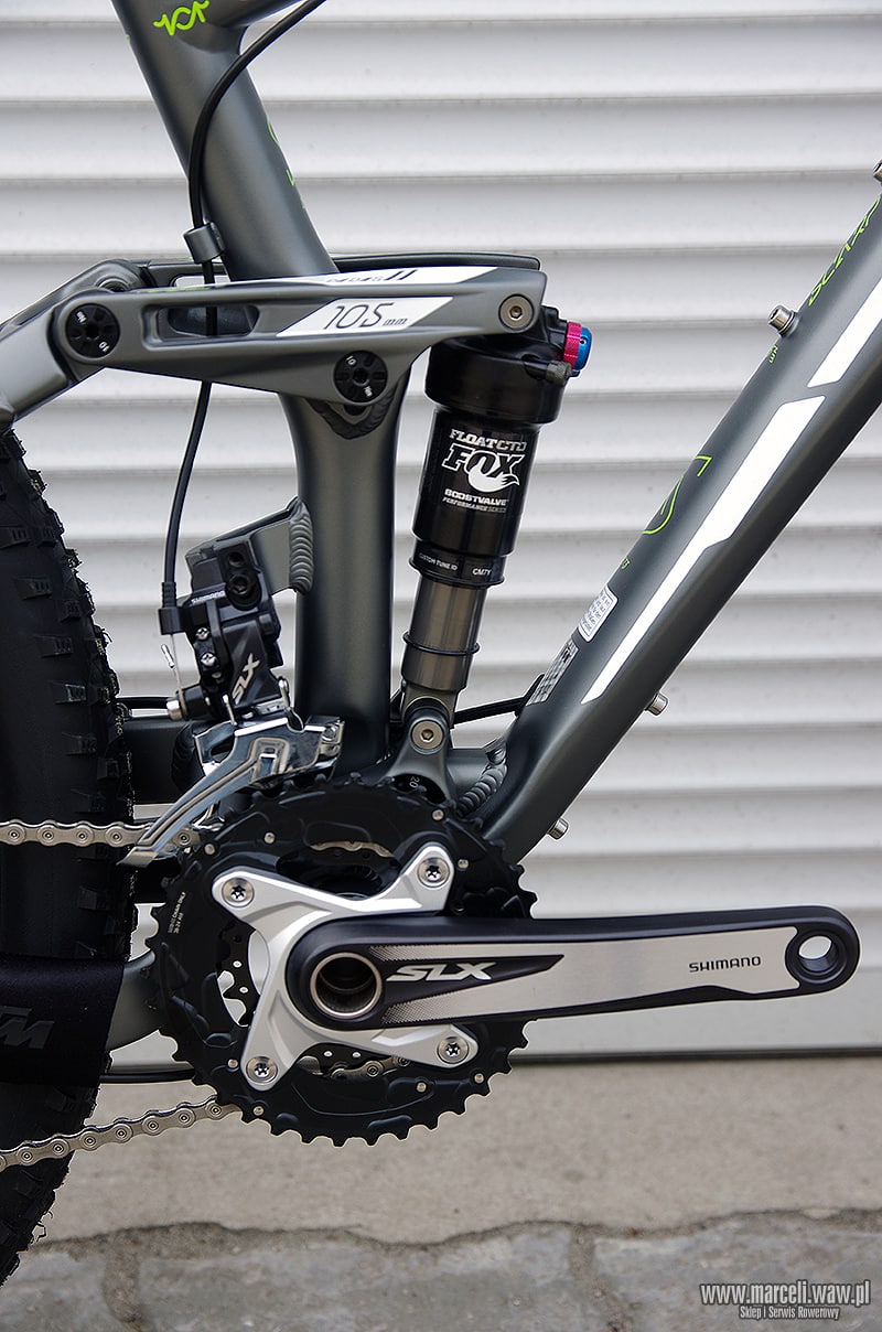 Rower‬ KTM Scarp 273. Amortyzacja roweru oparta na komponentach firmy FOX, osprzęt z grupy Shimano XT/SLX/Deore.
